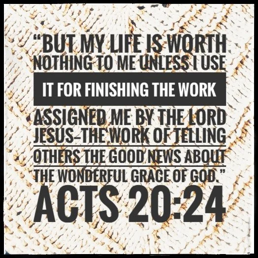 “But my life is worth nothing to me unless I use it for finishing the work assigned me by the Lord Jesus—the work of telling others the Good News about the wonderful grace of God.”—Acts 20:24 (NLT)